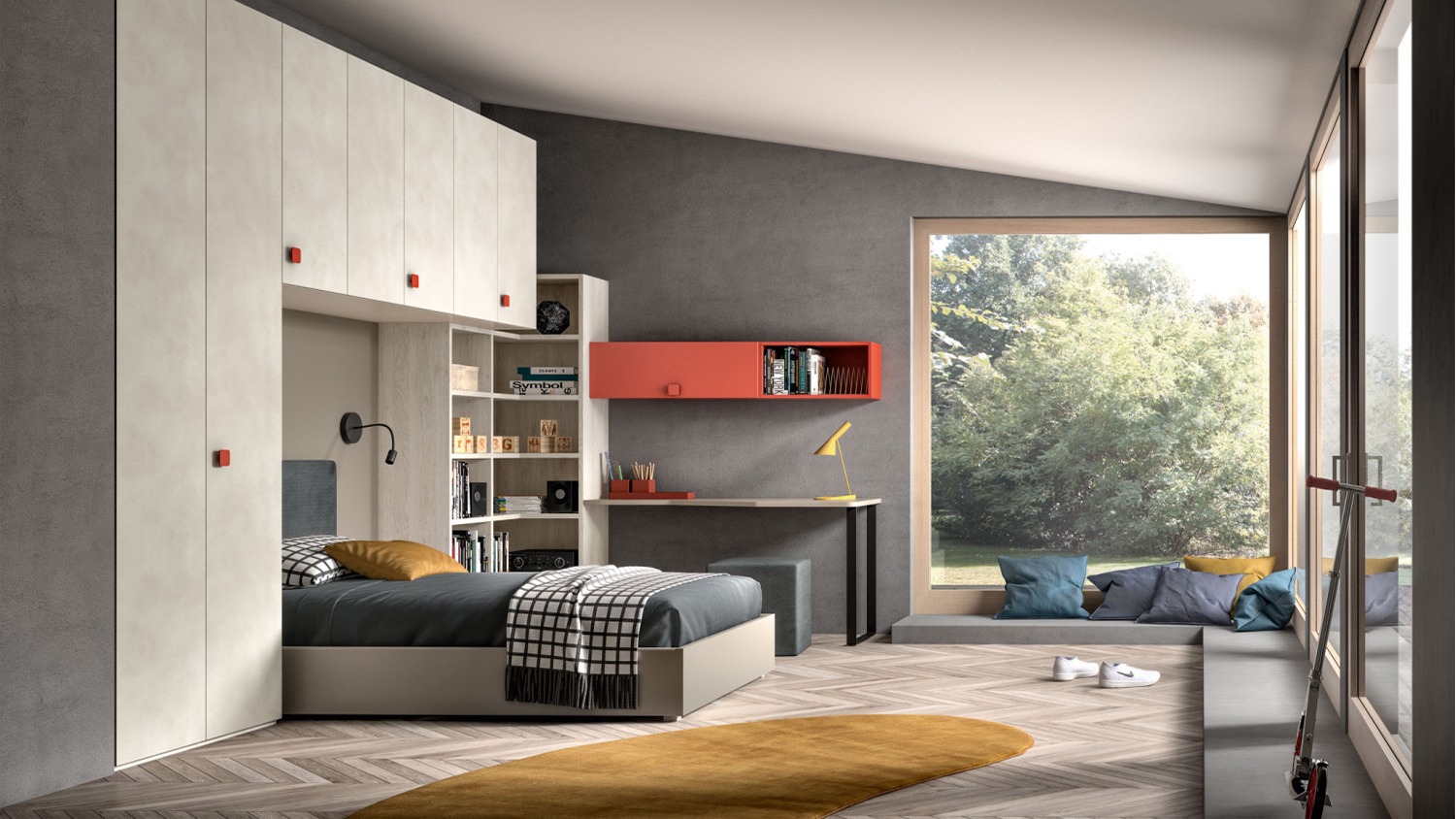 Lo scrittoio contribuisce con il suo design, i suoi materiali ed i suoi colori a definire la personalità dell’ambiente di lavoro. La libreria ad angolo sfrutta tutto lo spazio con tanti ripiani per riporre gli oggetti desiderati. Un arredo polifunzionale con una soluzione con armadio a ponte rivisitato in chiave moderna. Il letto da una piazza e mezza è adatto sia al ragazzo che al single. La libreria in Rovere Chiaro unitamente allo scrittoio appositamente sagomato, creano l’angolo studio ideale.